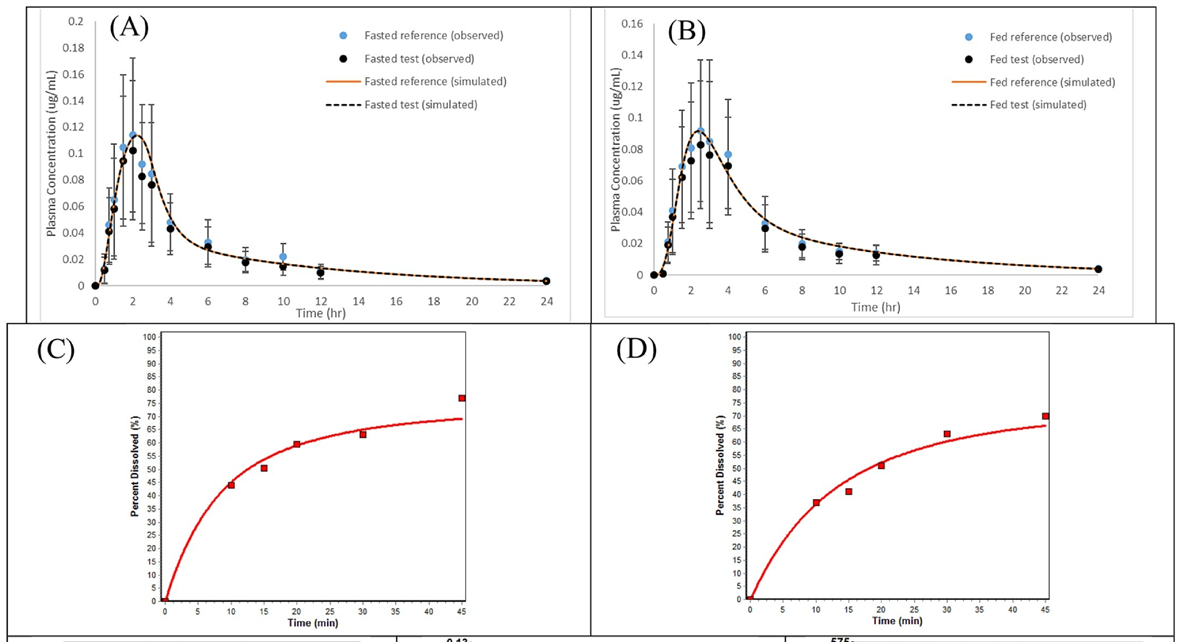 在Rebeka jereb等人撰寫的文章所建立6個藥代動力學模型預測結(jié)果均能與實測值擬合較好,虛擬BE結(jié)果與實際BE結(jié)果相似,文章通過案例研究證明了如果空腹BE結(jié)果可以準確預測,對于BCS1類和BCS2類化合物是極有可能預測餐后BE結(jié)果。