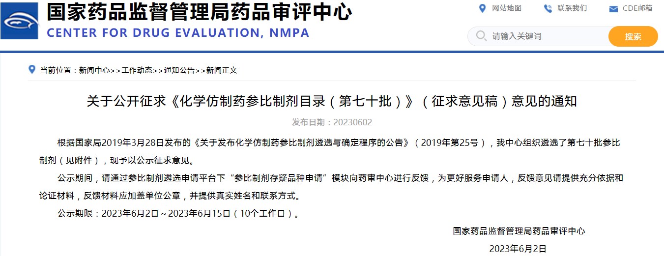 關于公開征求《化學仿制藥參比制劑目錄(第七十批)》(征求意見稿)意見的通知