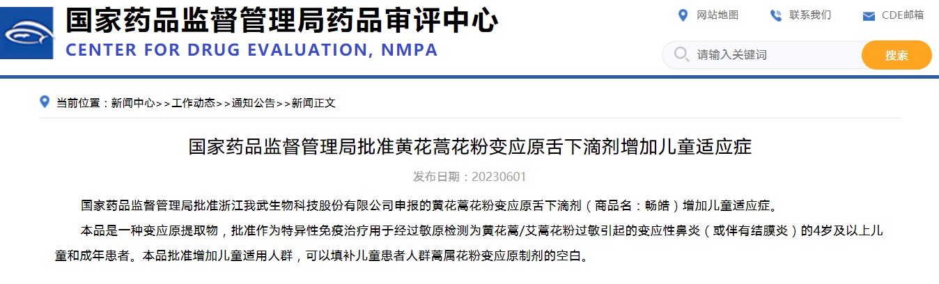 國家藥品監(jiān)督管理局批準黃花蒿花粉變應原舌下滴劑增加兒童適應癥