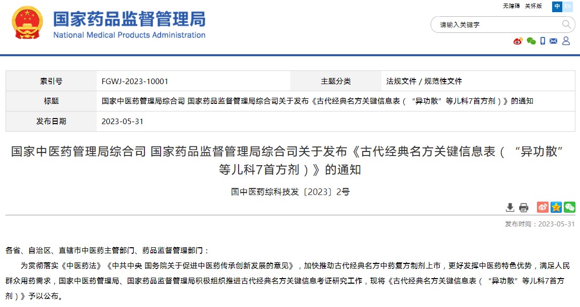 國家中醫(yī)藥管理局綜合司 國家藥品監(jiān)督管理局綜合司關于發(fā)布《古代經(jīng)典名方關鍵信息表(“異功散”等兒科7首方劑)》的通知