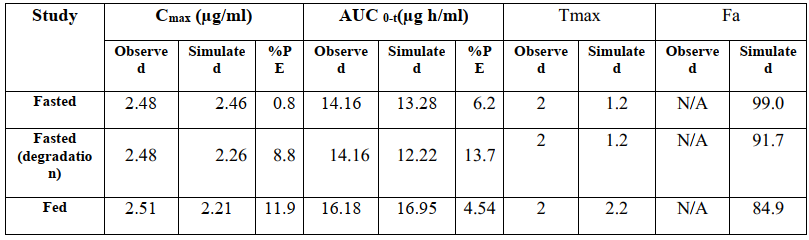 使用GastroPlus軟件PBPK模型對(duì)口服給藥的克拉霉素500mg速釋片進(jìn)行建模,部分建模參數(shù)如表2,其他參數(shù)為軟件默認(rèn)。模型預(yù)測(cè)參數(shù)與觀測(cè)值詳見(jiàn)表3,經(jīng)比較,預(yù)測(cè)值與觀測(cè)值誤差不超過(guò)10%,表明此次建模具有較好的預(yù)測(cè)性。由于食物減慢了胃排空速率,餐后給藥Tmax延長(zhǎng)。同時(shí),模擬結(jié)果表明食物對(duì)Cmax和AUC無(wú)顯著性影響。