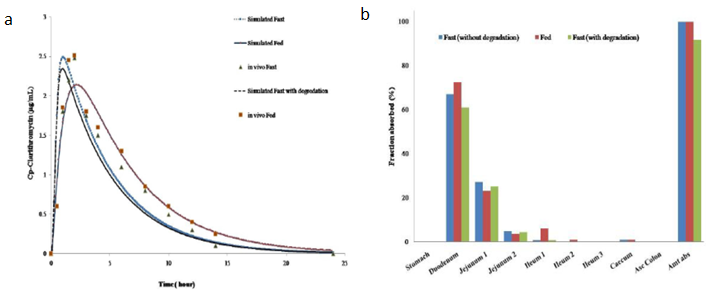 圖3 a:空腹和餐后試驗(yàn)下克拉霉素模擬和觀測(cè)血漿濃度;b:空腹和餐后試驗(yàn)下克拉霉素的吸收分布