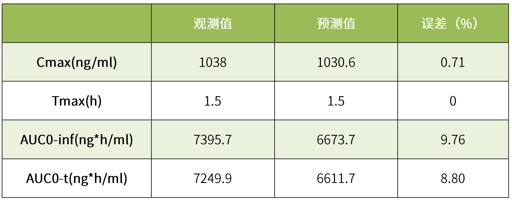 我司擁有國(guó)內(nèi)首個(gè)體內(nèi)外橋接(IVIVR)研發(fā)平臺(tái),不僅擁有Gastroplus軟件,而且完成了克拉霉素片仿制藥的申報(bào)。小編這里運(yùn)用GastroPlus軟件的PBPK模型對(duì)克拉霉素片進(jìn)行模型驗(yàn)證。將我司獲得的餐后狀態(tài)下的體內(nèi)PK數(shù)據(jù)輸入該模型中,模擬結(jié)果見(jiàn)表6。根據(jù)結(jié)果可知,我司取得的餐后PK數(shù)據(jù)與模型觀測(cè)值擬合度極高,誤差小于10%,二者血漿濃度藥時(shí)曲線(xiàn)也幾乎完全吻合,標(biāo)明該模型具有良好的預(yù)測(cè)性。