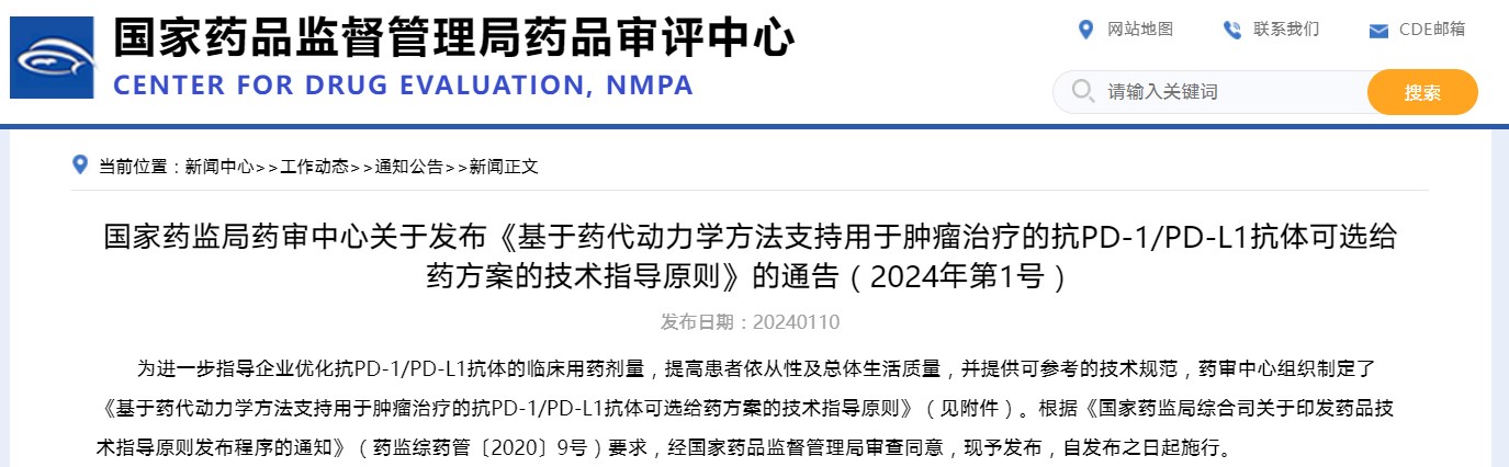 國家藥監(jiān)局藥審中心關(guān)于發(fā)布《基于藥代動力學方法支持用于腫瘤治療的抗PD-1/PD-L1抗體可選給藥方案的技術(shù)指導原則》的通告(2024年第1號)