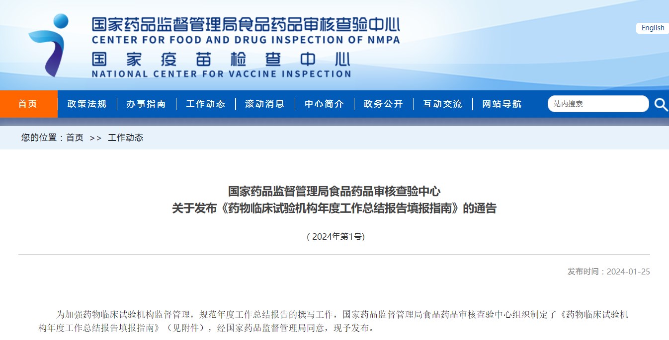 國家藥品監(jiān)督管理局食品藥品審核查驗中心關(guān)于發(fā)布《藥物臨床試驗機構(gòu)年度工作總結(jié)報告填報指南》的通告