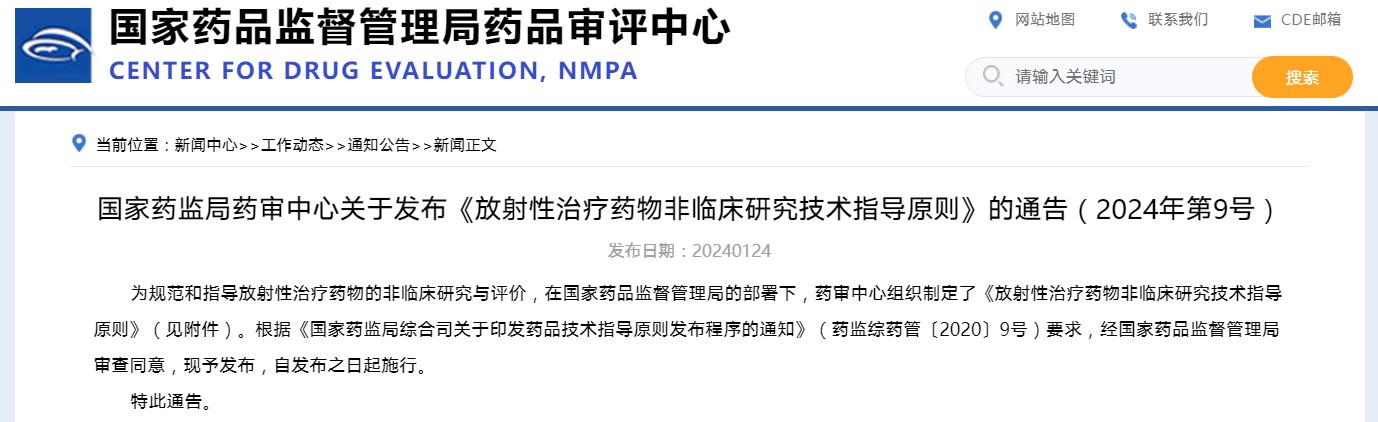 國家藥監(jiān)局藥審中心關(guān)于發(fā)布《放射性治療藥物非臨床研究技術(shù)指導(dǎo)原則》的通告(2024年第9號)