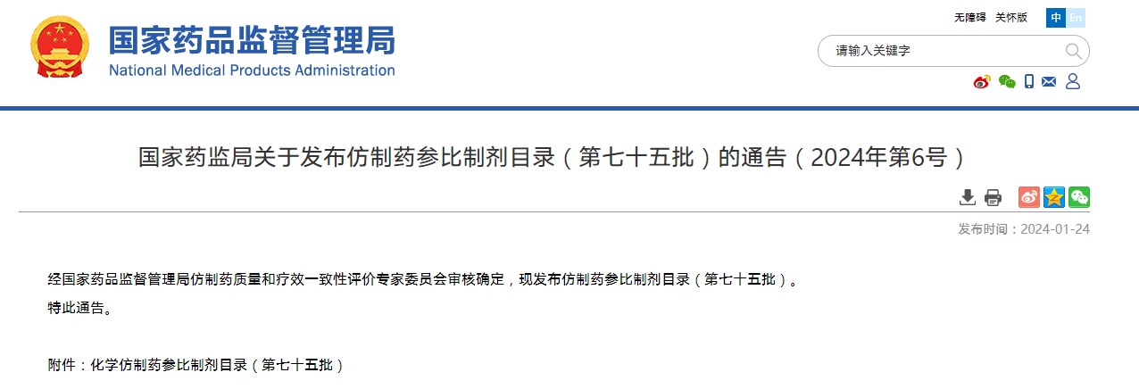 國家藥監(jiān)局關(guān)于發(fā)布仿制藥參比制劑目錄(第七十五批)的通告(2024年第6號)