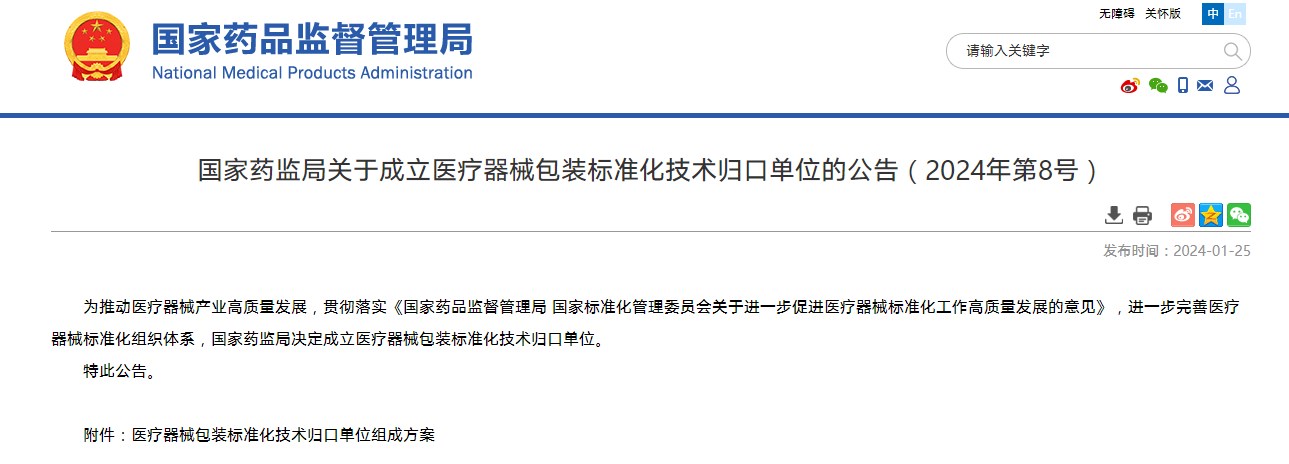 國家藥監(jiān)局關(guān)于成立醫(yī)療器械包裝標(biāo)準(zhǔn)化技術(shù)歸口單位的公告(2024年第8號)