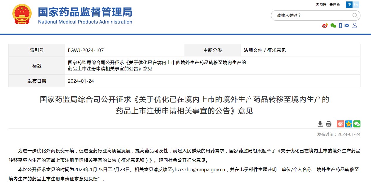 國家藥監(jiān)局綜合司公開征求《關(guān)于優(yōu)化已在境內(nèi)上市的境外生產(chǎn)藥品轉(zhuǎn)移至境內(nèi)生產(chǎn)的藥品上市注冊申請相關(guān)事宜的公告》意見
