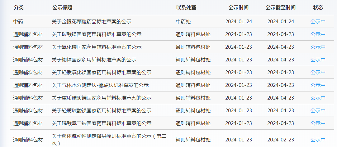 本周藥典委發(fā)布關(guān)于金銀花顆粒等5個品種藥品標(biāo)準(zhǔn)草案,碳酸鎂等5個品種藥用輔料標(biāo)準(zhǔn)草案,以及關(guān)于粉體流動性測定指導(dǎo)原則標(biāo)準(zhǔn)草案、藥品包裝用陶瓷吸水率測定法標(biāo)準(zhǔn)草案、藥品包裝用陶瓷瓶及組件通則的公示。