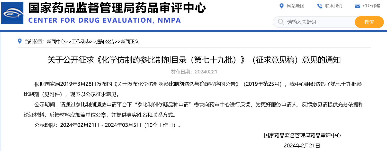 關(guān)于公開(kāi)征求《化學(xué)仿制藥參比制劑目錄(第七十九批)》(征求意見(jiàn)稿)意見(jiàn)的通知