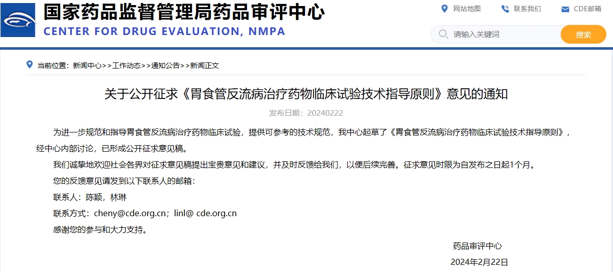 關(guān)于公開(kāi)征求《胃食管反流病治療藥物臨床試驗(yàn)技術(shù)指導(dǎo)原則》意見(jiàn)的通知