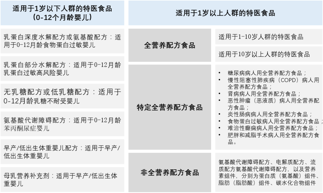 特殊醫(yī)學(xué)用途配方食品分為供1歲以下嬰兒食用的特殊醫(yī)學(xué)用途嬰兒配方食品和供1歲以上人群食用的特殊醫(yī)學(xué)用途配方食品。適用于1歲以上人群的特醫(yī)食品又分為全營養(yǎng)配方食品、特定全營養(yǎng)配方食品和非全營養(yǎng)配方食品。