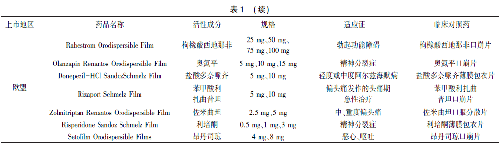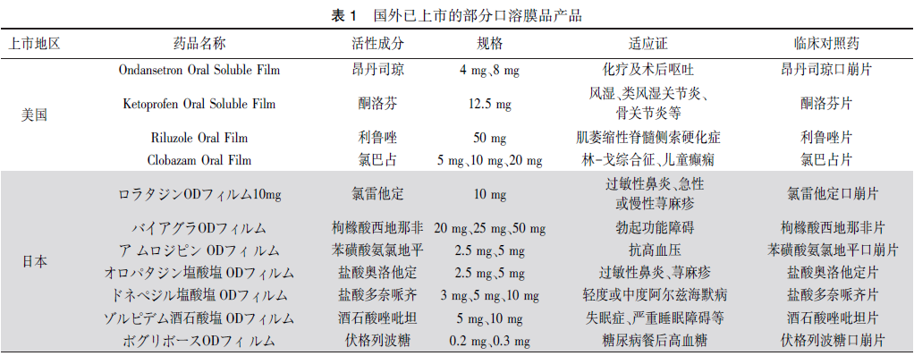 2006年,日本上市了第一個(gè)口溶膜處方藥伏格列波糖口溶膜。2010年,美國和歐洲分別上市第一個(gè)口溶膜處方藥昂丹司瓊口溶膜(Rapidfilm和Setofilm)。2020年,國家藥品監(jiān)督管理局批準(zhǔn)了第一個(gè)口溶膜化學(xué)藥品奧氮平口溶膜上市。目前,全球已有多個(gè)口溶膜產(chǎn)品上市,查詢美國、歐洲、日本藥品監(jiān)管機(jī)構(gòu)網(wǎng)站,部分品種信息見表1。