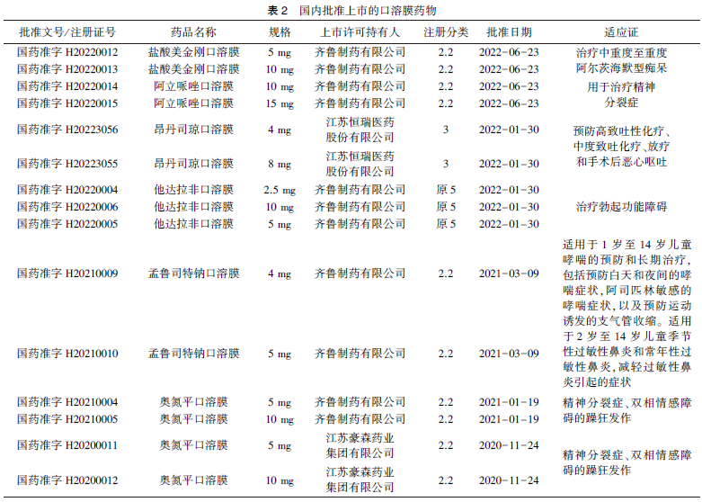 通過國家藥品監(jiān)督管理局網(wǎng)站查詢,統(tǒng)計(jì)了我國批準(zhǔn)的口溶膜藥物(見表2),共15個(gè)批準(zhǔn)文號,按照注冊分類統(tǒng)計(jì),其中10個(gè)為2.2類改良型新藥,占大多數(shù);按適應(yīng)證統(tǒng)計(jì),其中6個(gè)為精神障礙疾病藥物、3個(gè)為生殖系統(tǒng)疾病藥物、2個(gè)為精神神經(jīng)系統(tǒng)藥物、2個(gè)為呼吸系統(tǒng)疾病及抗過敏藥物、2個(gè)消化道及代謝藥物。