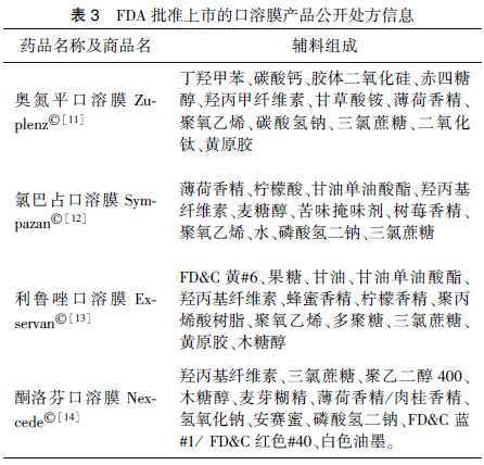 調(diào)研美國食品藥品監(jiān)督管理局(Food and Drug Administration,F(xiàn)DA)批準(zhǔn)上市的口溶膜處方如表3所示。其中羥丙甲纖維素、羥丙基纖維素為常用的成膜材料,甘油、甘油單油酸酯為常用的增塑劑,三氯蔗糖、香精為常用的矯味劑。