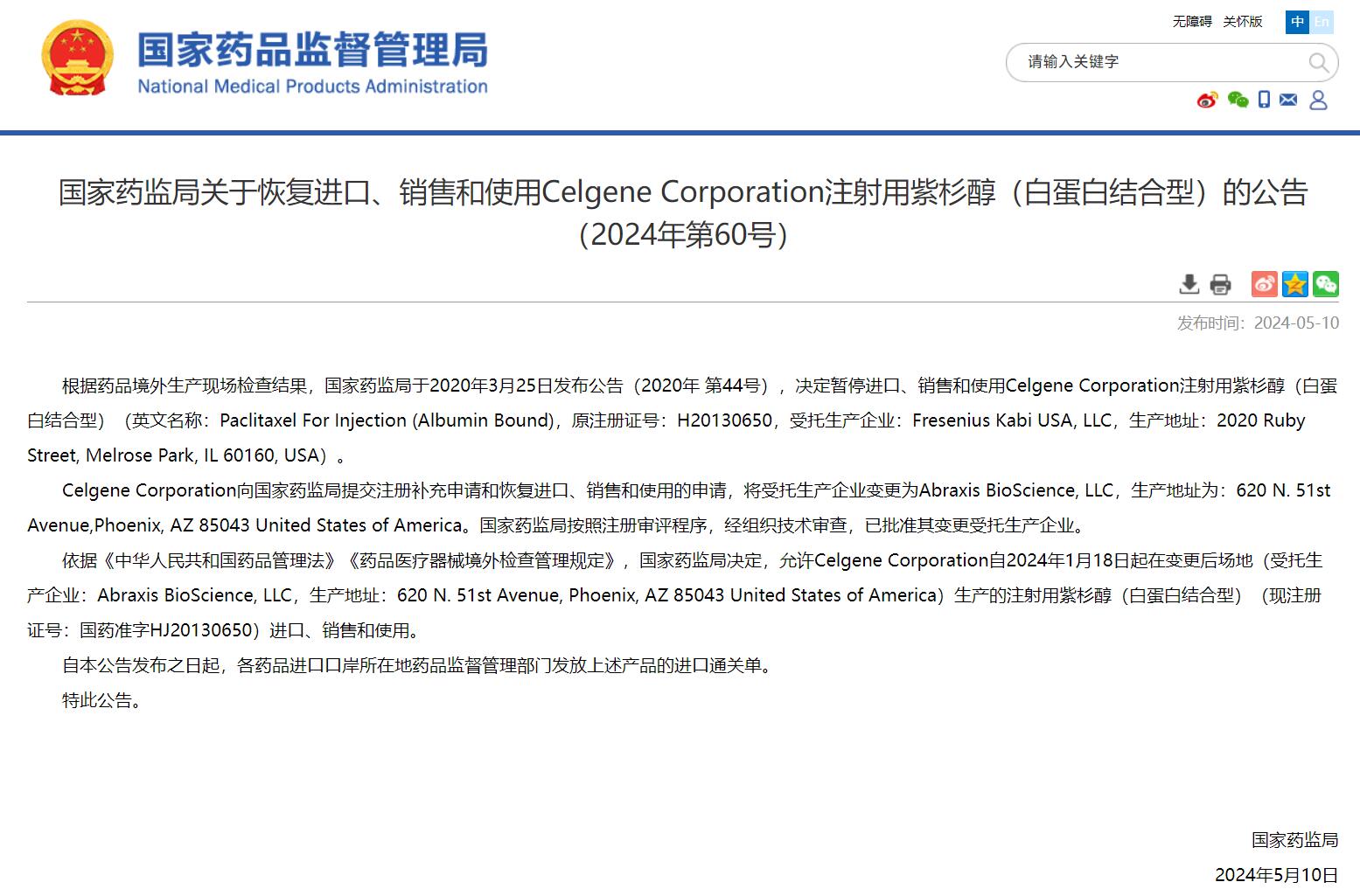 國家藥監(jiān)局關(guān)于恢復(fù)進口、銷售和使用Celgene Corporation注射用紫杉醇(白蛋白結(jié)合型)的公告(2024年第60號)