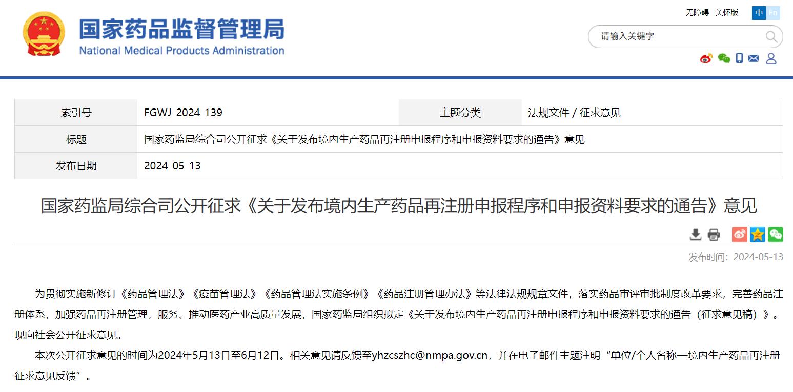 國家藥監(jiān)局綜合司公開征求《關(guān)于發(fā)布境內(nèi)生產(chǎn)藥品再注冊申報程序和申報資料要求的通告》意見