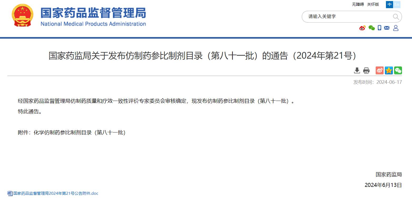 國家藥監(jiān)局關(guān)于發(fā)布仿制藥參比制劑目錄(第八十一批)的通告(2024年第21號)