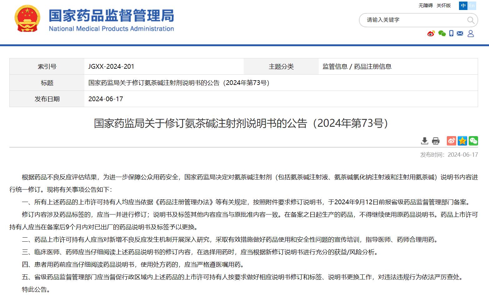 國家藥監(jiān)局關(guān)于修訂氨茶堿注射劑說明書的公告(2024年第73號)