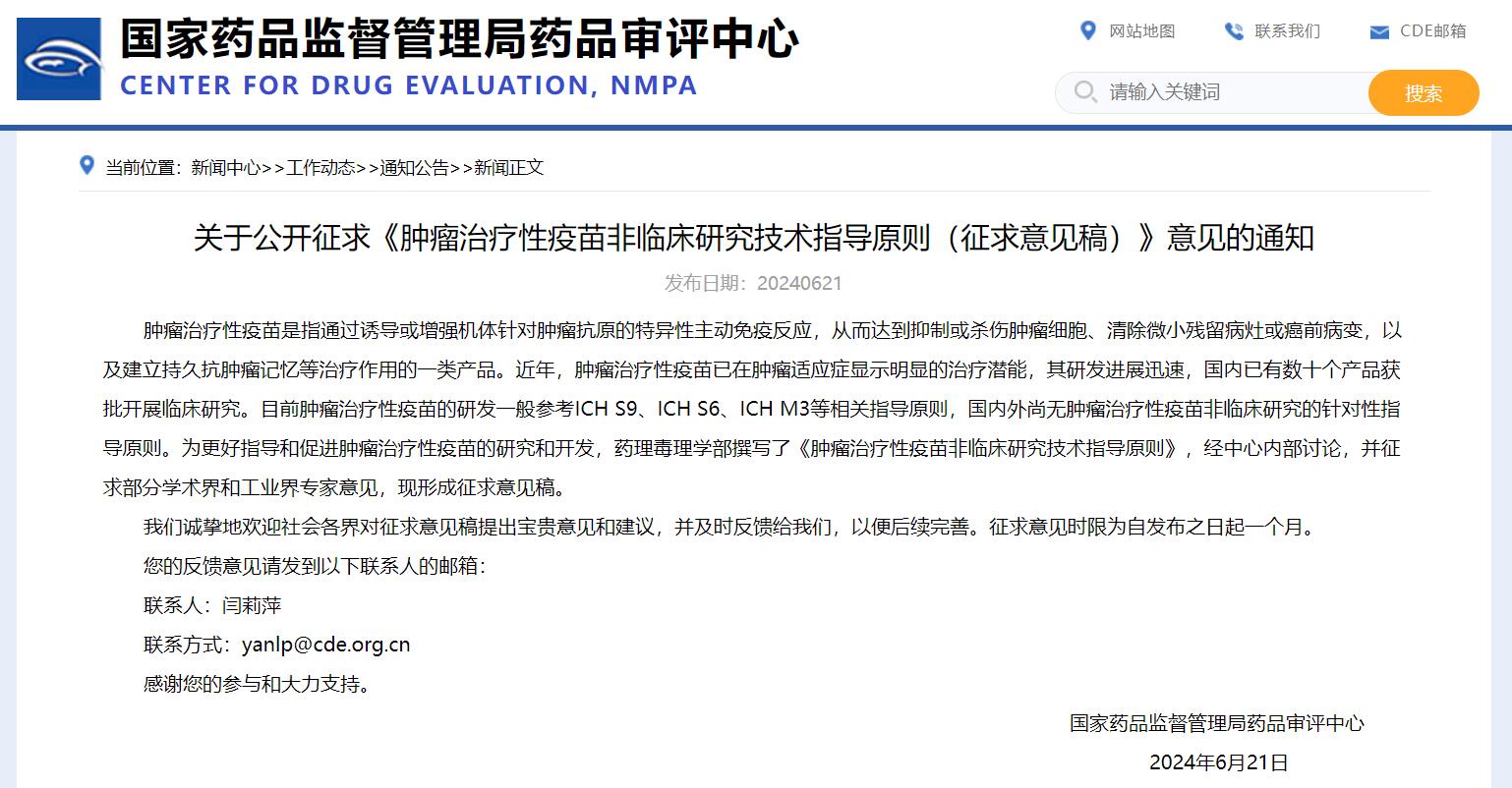 關(guān)于公開征求《腫瘤治療性疫苗非臨床研究技術(shù)指導(dǎo)原則(征求意見稿)》意見的通知