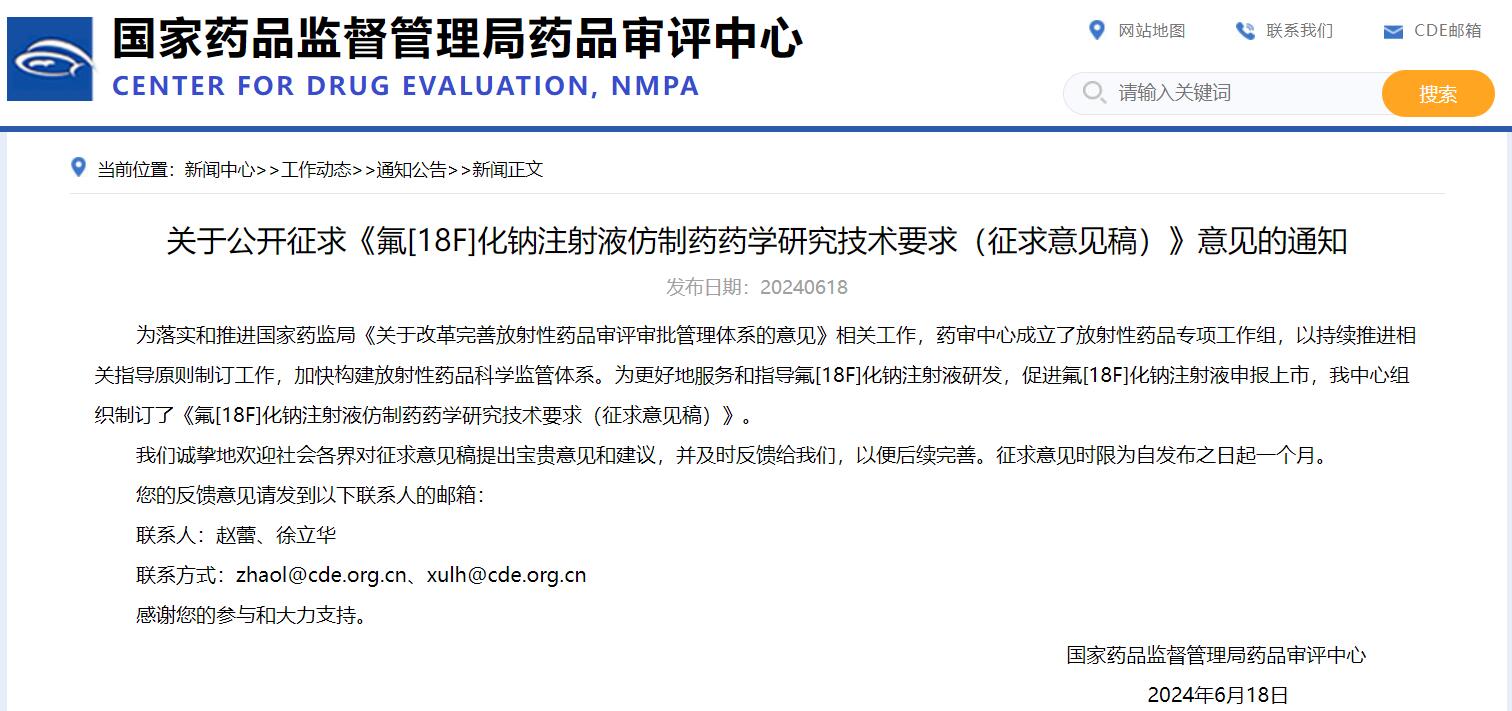 關(guān)于公開征求《氟[18F]化鈉注射液仿制藥藥學(xué)研究技術(shù)要求(征求意見稿)》意見的通知