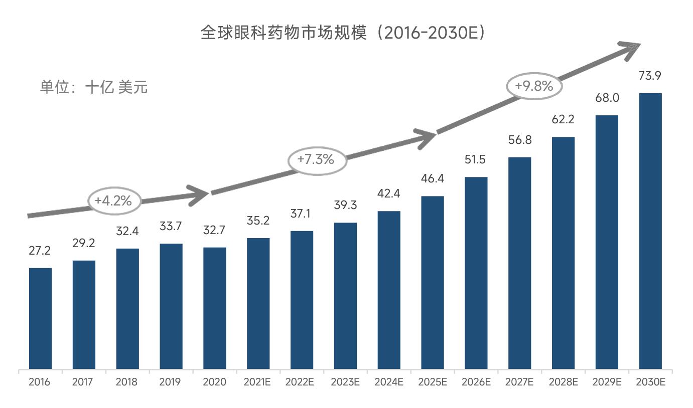 目前,全球眼科市場整體呈現(xiàn)出穩(wěn)定增長、集中度較高的特點。2016年至2020 年,全球眼科藥物市場規(guī)模從277億美元增長至327億美元,復合年增長率為 4.2%。隨著未來更多眼科創(chuàng)新藥物的研發(fā)和上市,預計2025年將達到464億美元,2030年將達到739億美元。2016-2020年中國眼科藥物市場規(guī)模從151億增長至188億元,復合年增長率達5.7%,預計2025年將達到440億元,2030年將達到1084億元。預計未來,中國將以超過全球2倍的平均增長率快速增長,發(fā)展勢頭強勁。