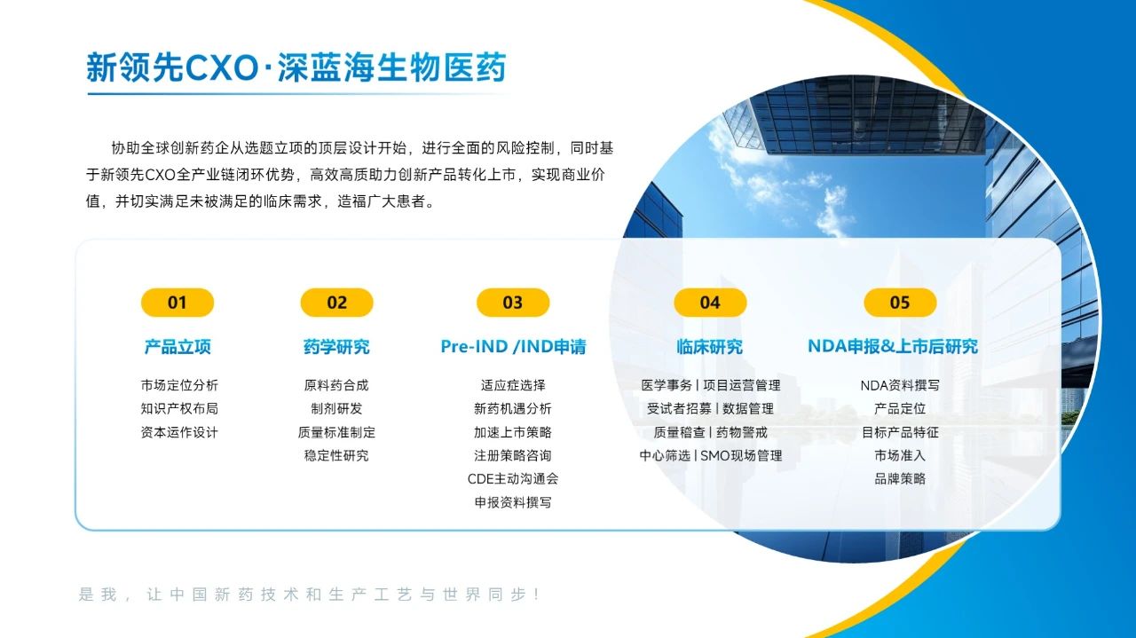 深藍(lán)海生物醫(yī)藥是新領(lǐng)先醫(yī)藥(股票代碼600222 )在臨床 CRO 領(lǐng)域的子品牌,成立于 2007 年,秉持“以終為始,頂層設(shè)計(jì),做新藥創(chuàng)制的全程合作伙伴"的服務(wù)理念,為全球藥企提供覆蓋生物藥、化藥、中藥、醫(yī)療器械、細(xì)胞與基因治療等I-III期臨床研究、生物等效性研究、上市后研究、第三方稽查、IND和NDA申報(bào)以及醫(yī)學(xué)事務(wù)等服務(wù)??蓾M足不同研發(fā)型企業(yè)的臨床研究定制需求,為國內(nèi)外客戶打通新藥上市前關(guān)鍵瓶頸。