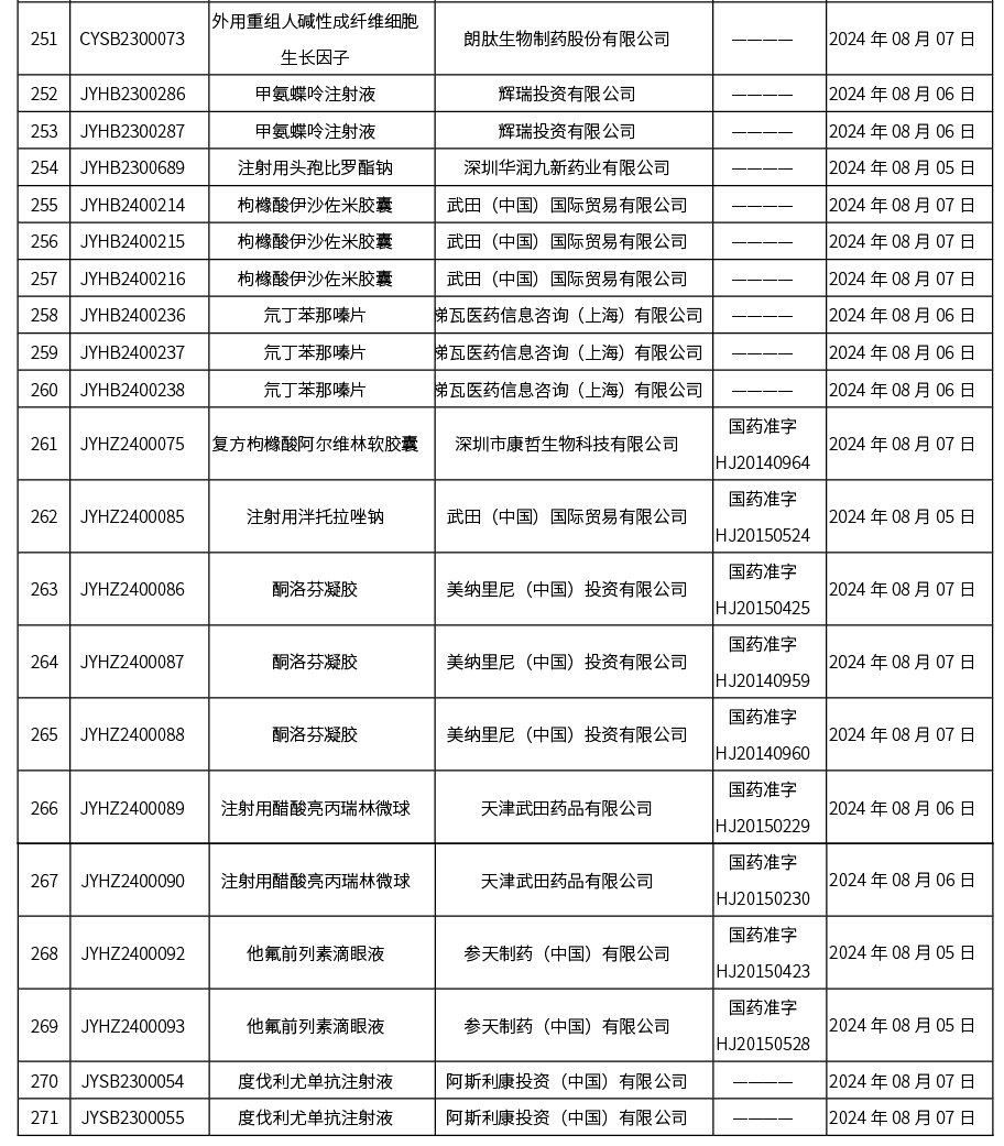 本周(截至2024年8月09日15:00),共發(fā)布藥品批準證明文件送達信息271個,其中一致性評價38個,注射劑118個。