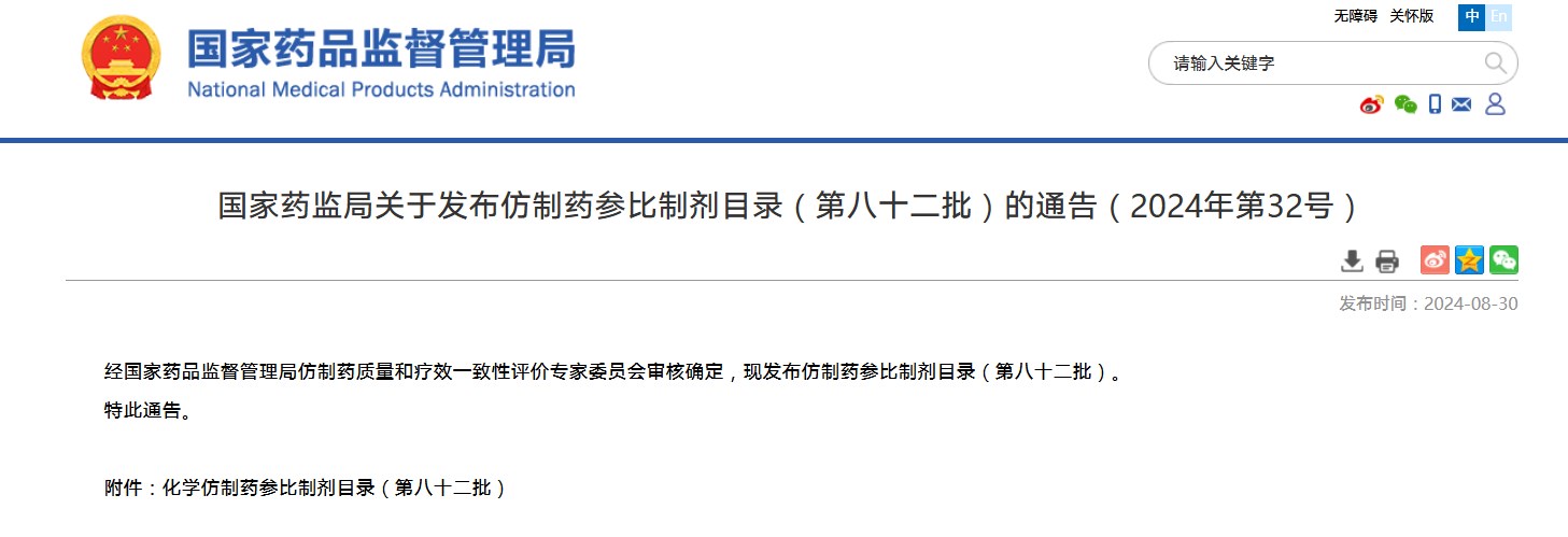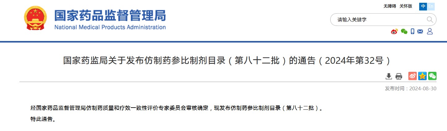 國(guó)家藥監(jiān)局關(guān)于發(fā)布仿制藥參比制劑目錄(第八十二批)的通告(2024年第32號(hào))