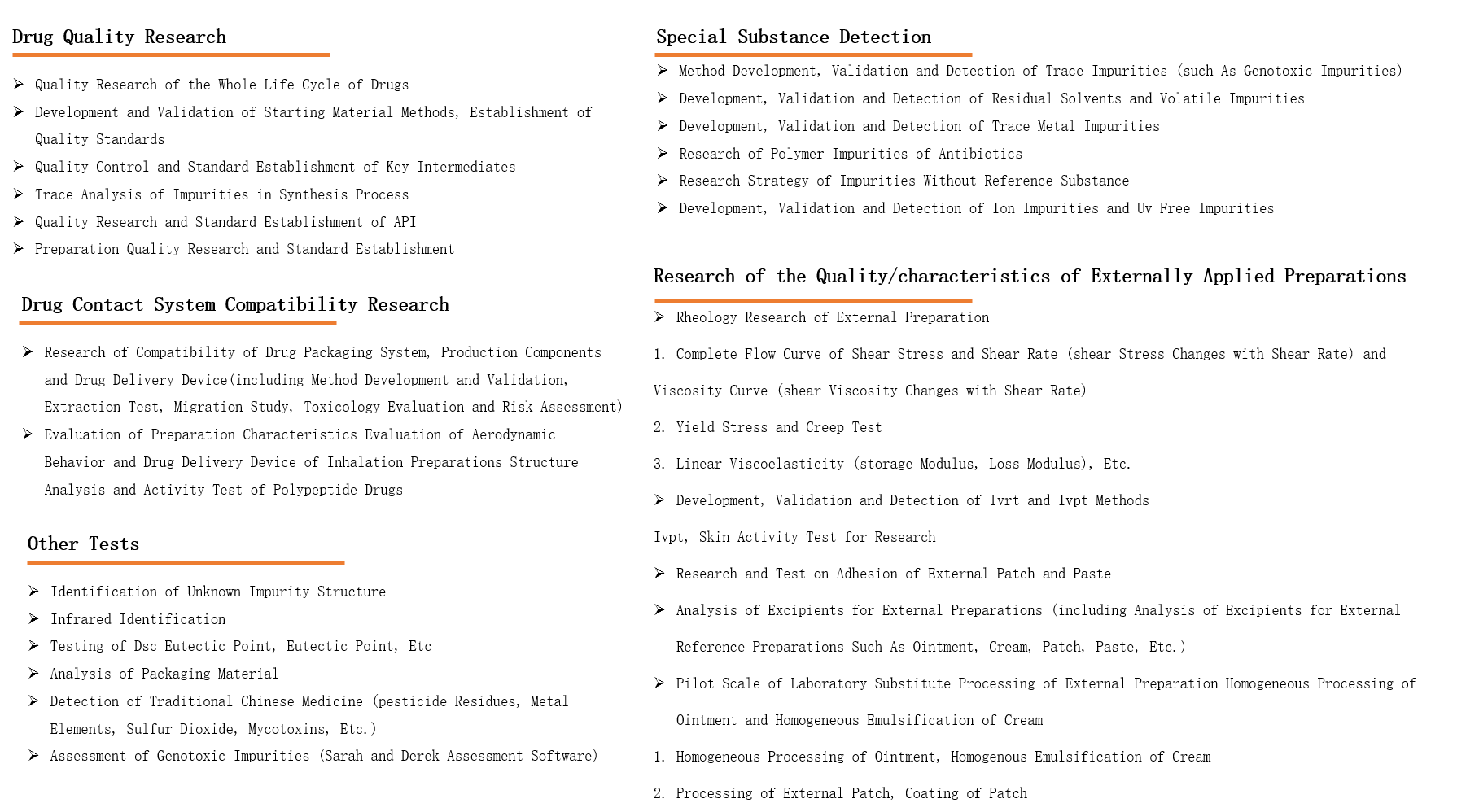 ♦Based on advanced testing equipment and perfect quality management system of Leadingpharm, the Analytical Testing Center can help the project team complete the development of complex compound testing methods, compatibility research (packaging materials, drug delivery devices, production components, etc.) and the detection of special impurities (elemental impurities, genotoxic impurities, gold ions, polymers, etc.).