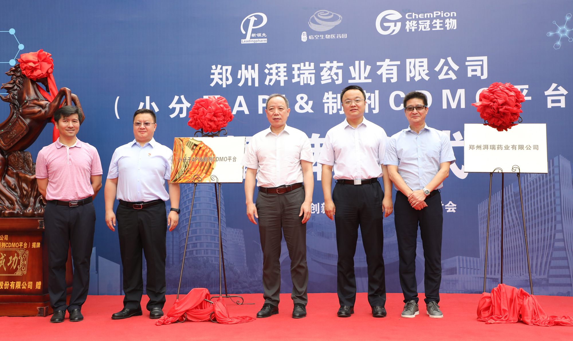 ▲Director Li Guohui (third from left), Director Yang Xiaofeng (second from left), Chairman Liu Jingyuan (fourth from left), Chairman Tao Xinhua (fifth from left) unveiled the CDMO platform for Zhengzhou Purui Pharmaceutical Co., Ltd. and Small Molecule API- preparation CDMO