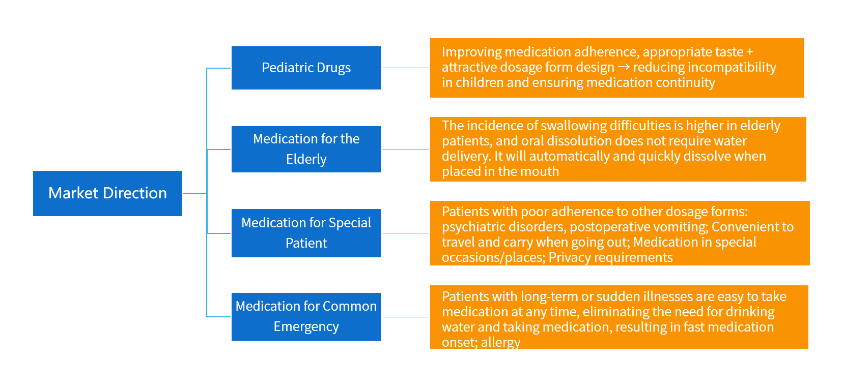 Oral dissolution films (ODF) are a novel drug delivery system that can rapidly dissolve in the oral cavity, making them particularly suitable for patients with swallowing difficulties, the elderly, pediatrics, or bedridden patients, as well as those who cannot easily obtain water. With the acceleration of population aging and the relaxation of fertility policies, oral films have a broader prospect.